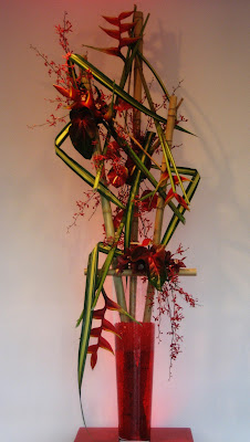 Another design from the same Oasis show featuring water tubes. They were placed in a drilled out log and grasses, oncidiums, viburnum berries and galax rosettes were used. Each spray was connected with flexi grass to be used as an armature.